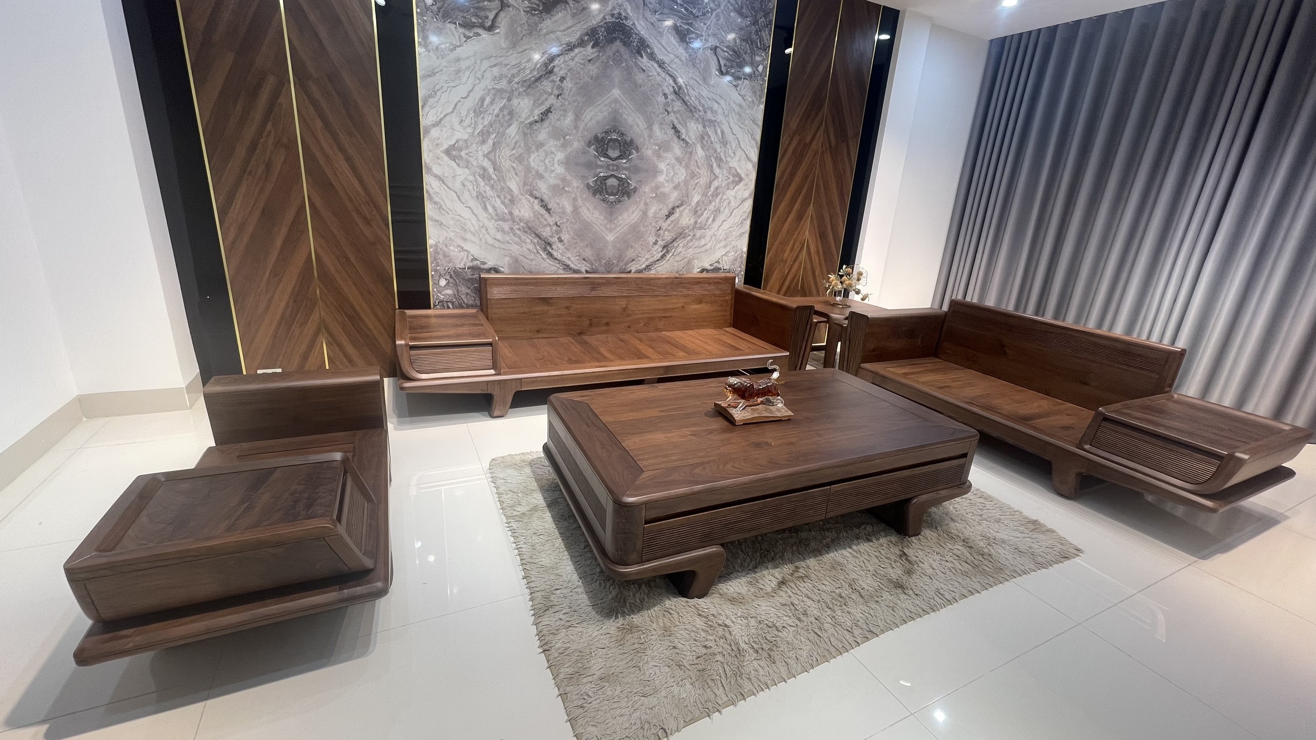 Bộ bàn ghế phòng khách sofa gỗ óc chó có màu nâu nhạt đến nâu socola, sau khi thành phẩm màu gỗ sẽ trở nên trầm hơn đồng thời độ bền lên tới trên 50 năm với khả năng chống mối mọt rất cao vì vậy thường được sử dụng phòng khách biệt thự penthouse căn hộ cao cấp sảnh khách sạn văn phòng