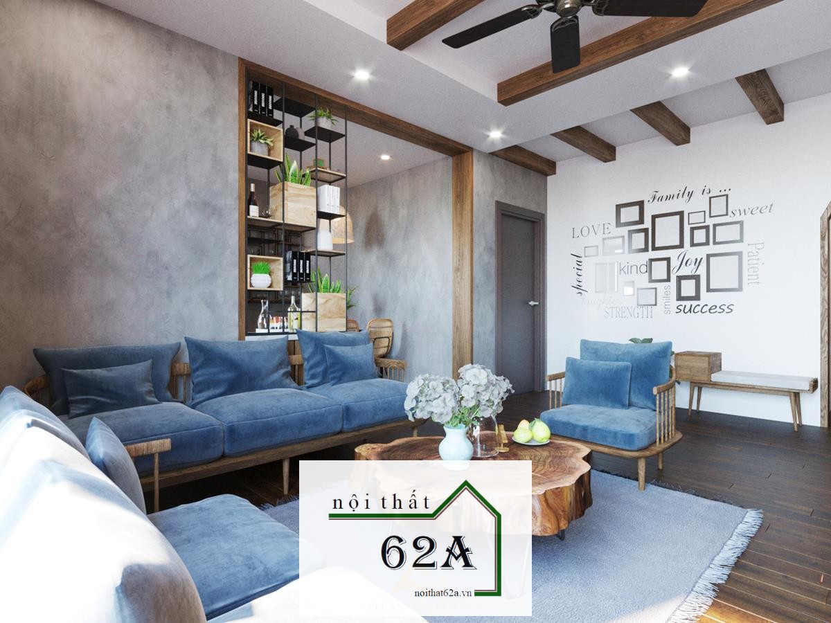 Không gian phòng khách nổi bật với tông màu xanh – nâu chủ đạo