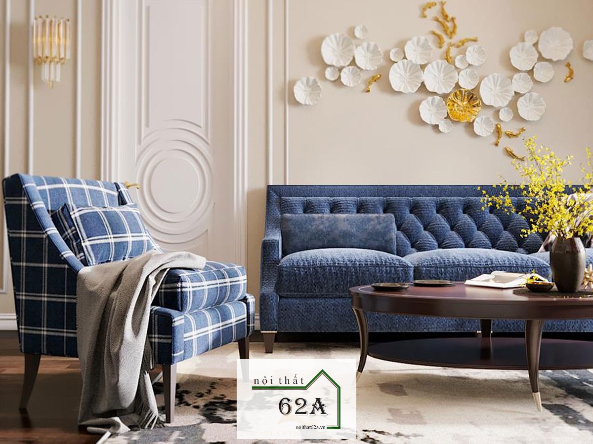 khó rời. Trung tâm căn phòng là bộ ghế sofa màu xanh lam kết hợp họa tiết caro nền